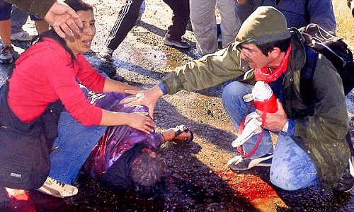 baleado en la marcha neuquina En el marco de una manifestacion por reclamos salariales con cortes de ruta en la Provincia de Neuquen fue asesinado por la represion policial con un disparo de gas lacrimogeno que estallo en su cabeza el maestro Alberto Fuentealba de 41 años de edad,casado y con dos hijos pequeños. A las 18 de hoy 4 de abril el parte medico diagnostico muerte cerebral lo que a las 23 horas fue confirmado al retirarse el respirador mecanico con la aprobacion de su familia. MUERTE DE